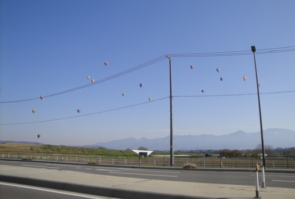 | 美ヶ原に向かう途中で佐久のバルーンフェスティバルに遭遇。20以上の気球が空を飛んでいた。 |