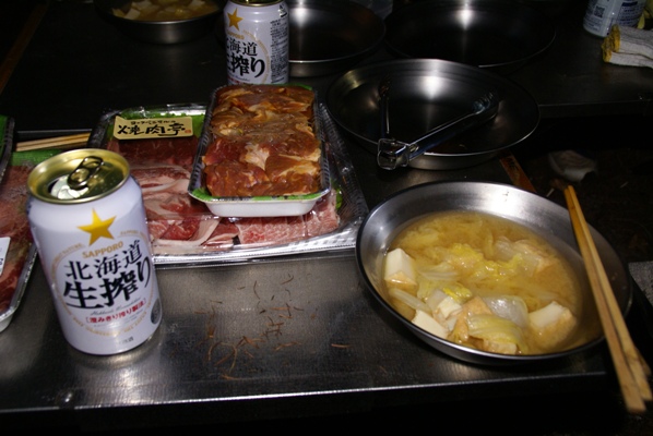 | 2日目の夕食は焼肉と味噌汁。歩いた後の焼肉、最高ですな。 |
