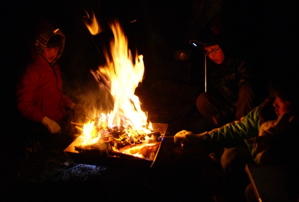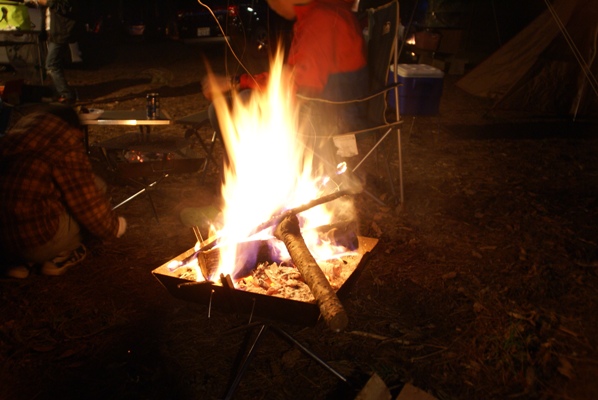 | 夕食後は焚火で団らん。子供たちがせっせと火をくべて火の番。 |