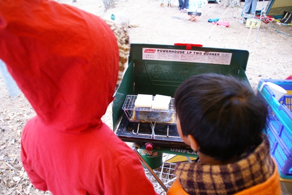 | 朝ご飯が足りず、モチが焼けるのを待つ子供たち。忘れ物多かったなー。 |