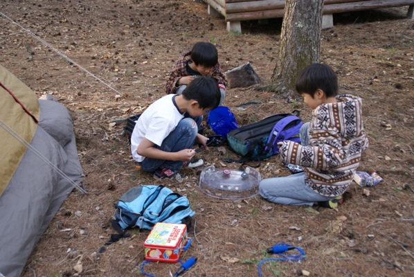 | 2日目も火遊びに精を出す子供たち。夜は冷え込むので焚火が楽しい季節。 |