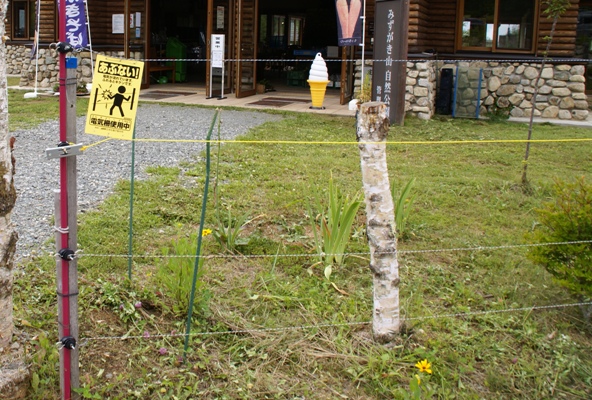 サイトの周りには電気柵が設置されていた。リョンが一度触ってヒヤッとしたが日中は通電されてなくて無事だった。 シカ除けなのかな?クマ出没の貼り紙もあったが。。 |