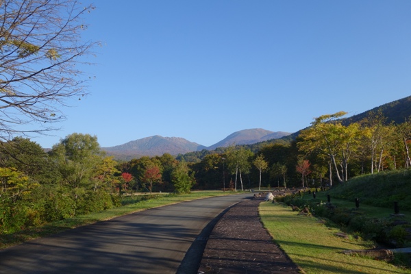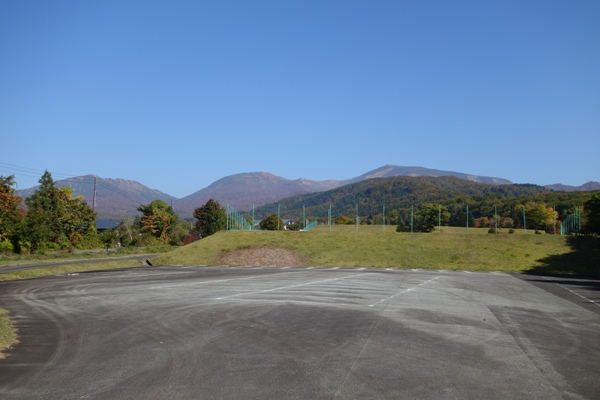 広い公園のスポーツエリアからは月山の山頂も見えた。ほんといい天気。 |
