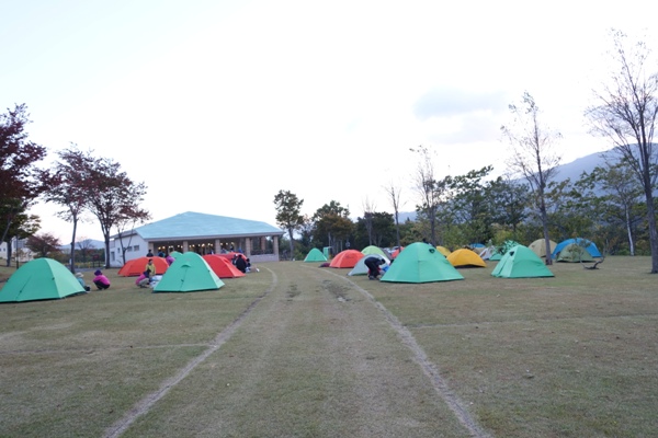 我が家はフリーサイトの一番端に設営。フリーサイトだけど区画の仕切りは有り。 |
