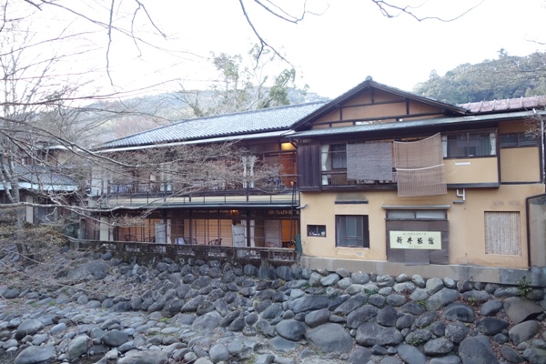 新井旅館・・・ただの古い旅館かと思いきや重要文化財と看板に書いてあった。 川沿いに見えたのは一部だけで建屋がたくさんある、由緒ある旅館みたい。 |