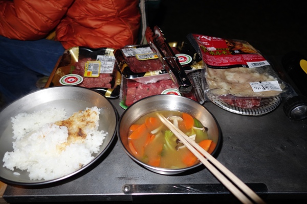 温泉観光を楽しんでサイトに戻り夕食。風がすごくて車の陰でなんとか火を熾して焼鳥を焼く。 |