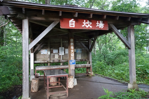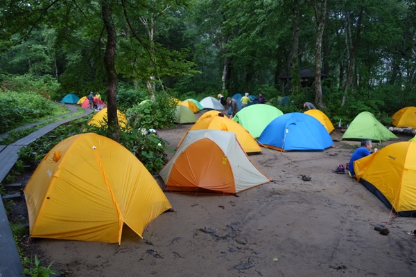 予約無で土のところに適当に張ります。多くのハイカーが行きかう木道のすぐ横なので、 木道近くだと朝5時過ぎから足音が聞こえます。空いているなら木道から離れたところの方が良さそう。 |