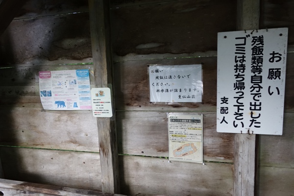 残飯は持ち帰り。国立公園の山の中ですからね。クマ注意とシカ狩り注意の貼り紙もありました。 |
