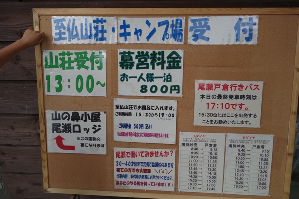 受付は隣にある至仏山荘で。売店、軽食コーナー、日帰り入浴と快適設備有り。お風呂は500円/1人、 ビールは540円/500ml、440円/350mlと500mlがお得(笑)。 |