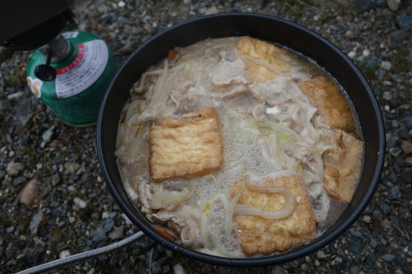 鍋というか野菜スープ。山道具でのキャンプも少し慣れてきたかな。 |