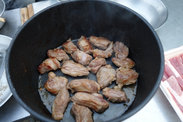 焼肉は結局鍋で焼きました。いそのの味付けサガリ肉、なかなか美味しかったです。リョンにかなり好評。 |