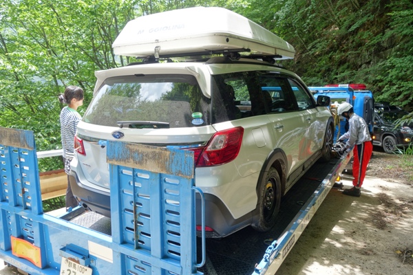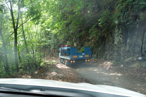 林道を塞いでしばらく作業していただき、タイや量販店まで運搬してもらいました。 |