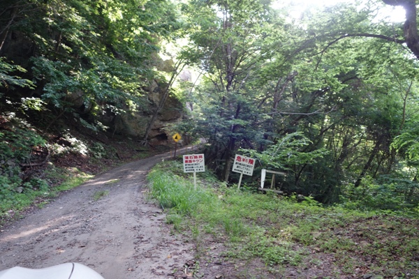 “危険”という看板が何度も出てくる林道を時速10q程度でゆっくり走りますが・・・ |
