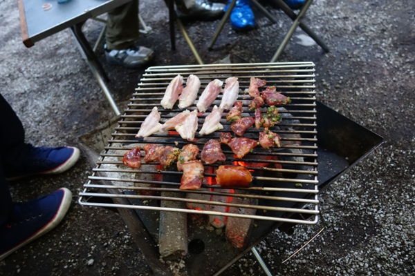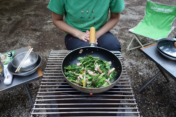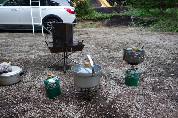 荷物のコンパクト化のためシングルバーナーの直置き。ご飯炊くのも久し振り? |