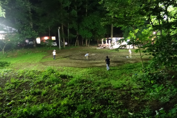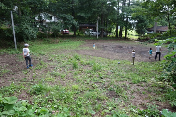 キャンプ場には広場があり、ボール等も貸し出してくれるので子供たちはさっそく遊びます。 |