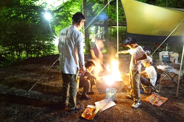 隣のサイトの子と仲良くなったようで、花火も一緒にやってます。