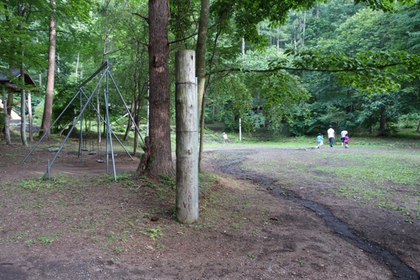 キャンプ場の中心にある広場。ブランコがあり、遊具も貸し出してくれます。 子供達が入れ替り立ち代り遊んでいました。 |