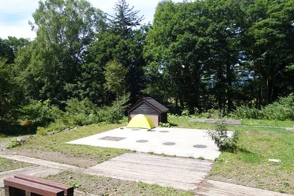 キャンプ場と休憩所前のベンチ。快適そう。 |