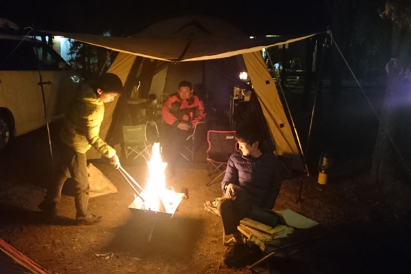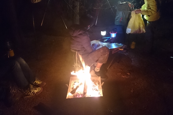 焚火タイム。我が家の次男坊が組長の次男くんを従えてせっせと火の番をしてくれました。 |