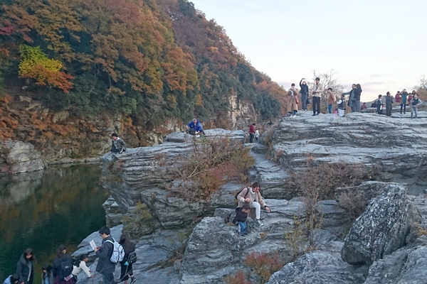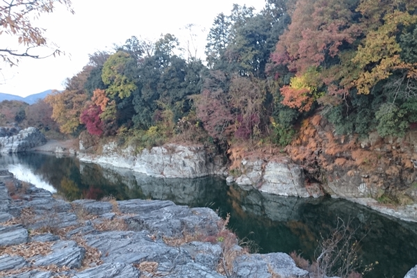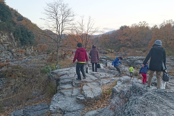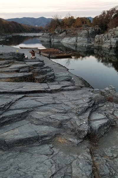 キャンプ場から30分弱歩いて岩畳に到着。天然記念物だそうです。 |