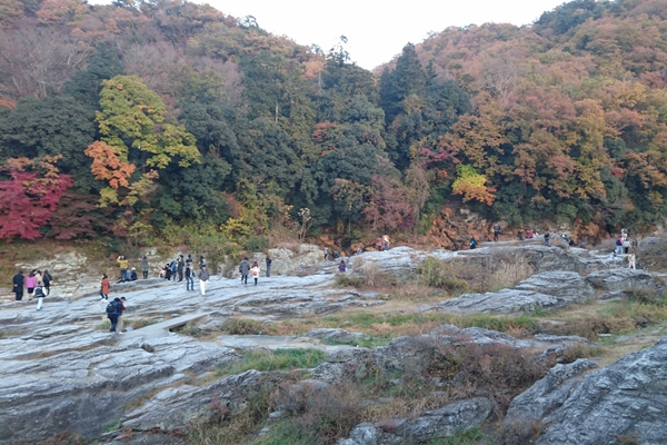 月の石もみじ公園に向けて岩畳の上を歩きます。大きなポットホールを目指して歩いたのですが、 どれか良く分かりませんでした。。 |