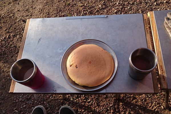 久し振りの定番、ホットケーキ。今回はレーズンとクルミ入りでグレードアップ。 |