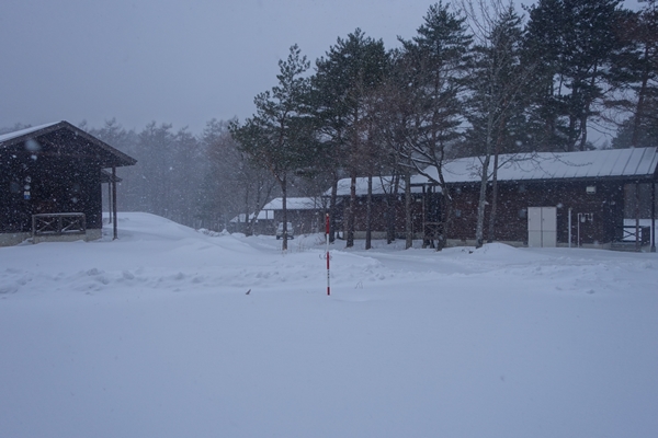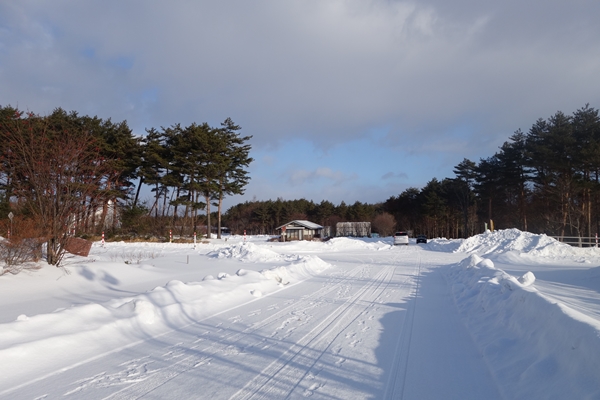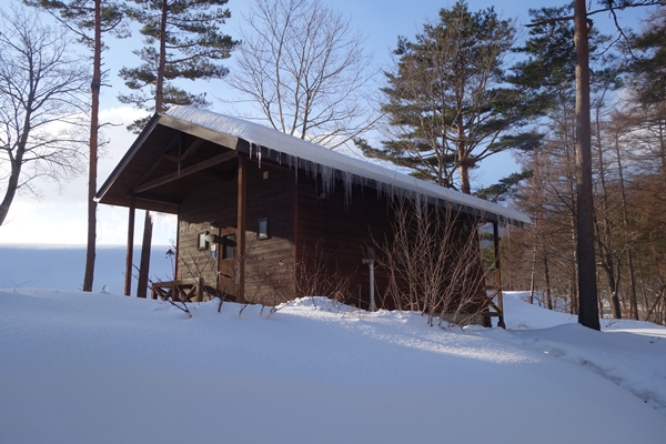 道路を挟んだ反対側がキャビン村とテントサイト。冬期はキャビン村のみ営業中でした。 |