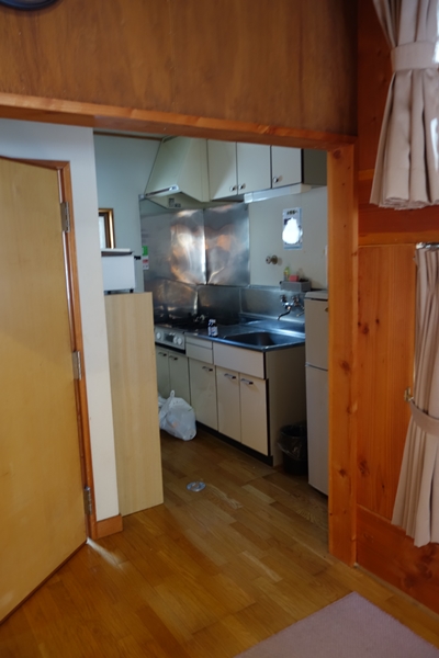 台所。ガスコンロに電子レンジ、トースター、電気ポットと一通りの設備が有ります。 |
