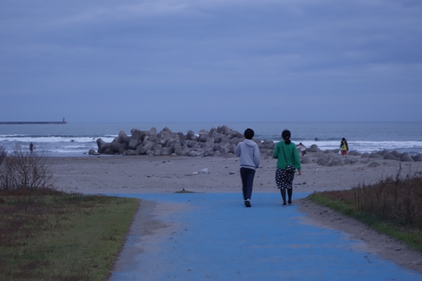 設営後夕暮れの大洗海岸へ。長男の身長が嫁さんに追いつきましたね。 |