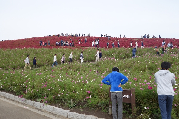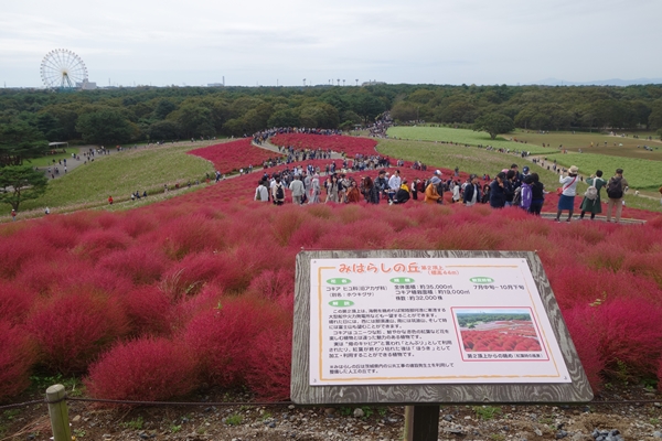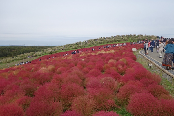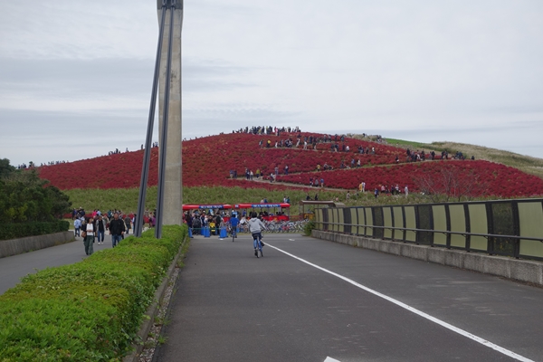 コキアの紅葉は見頃で真っ赤。人もわんさか。 |