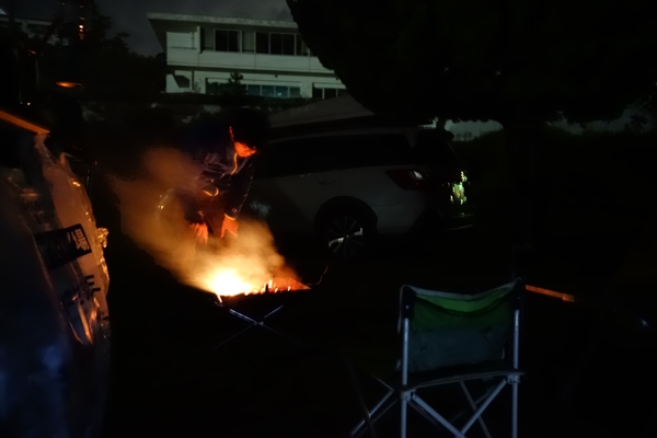 夕食後、焚き火タイム。サイトについてもゲームをやっていた次男も焚火だけは楽しげにやっていました。 |
