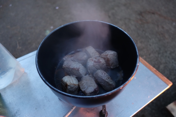 続いてのおつまみは一口ステーキ。 |