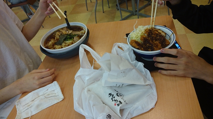 新潟のショッピングセンターでお昼ご飯。長男はラーメン、次男はソースかつ丼+唐揚げ。私はかつ丼。 |