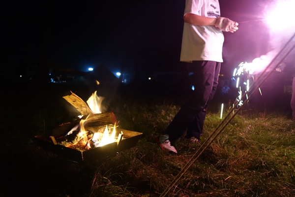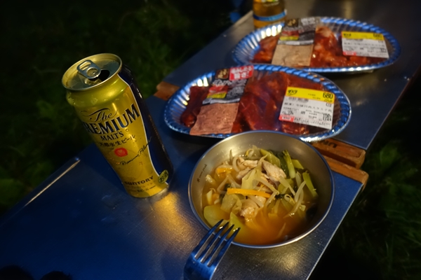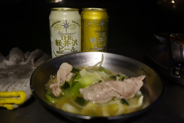 サイトに戻って夕食。長男が作ってくれたほうとう鍋でビールも美味い。 |