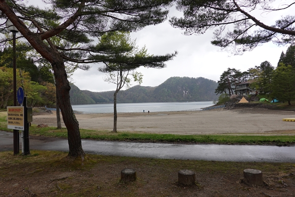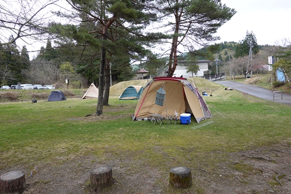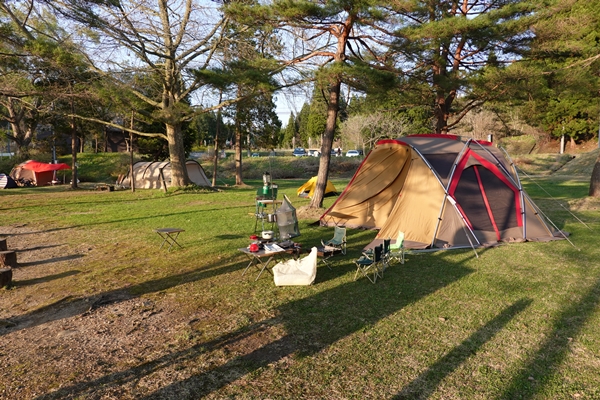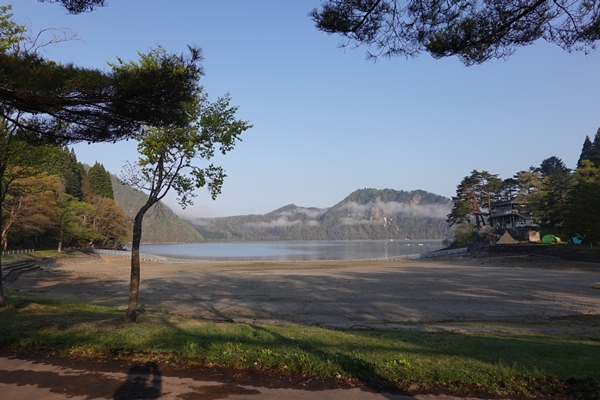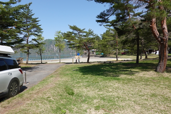 今年はフリーサイトに設営。オートサイトより湖が目の前でいいですね。 |