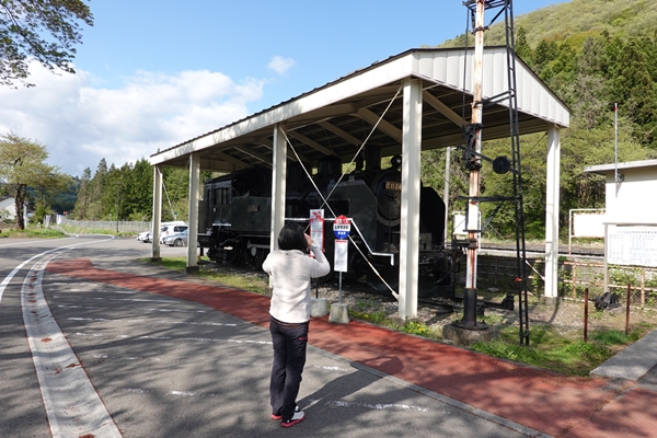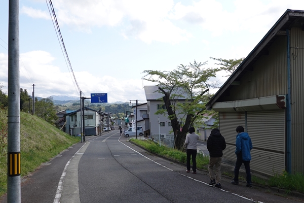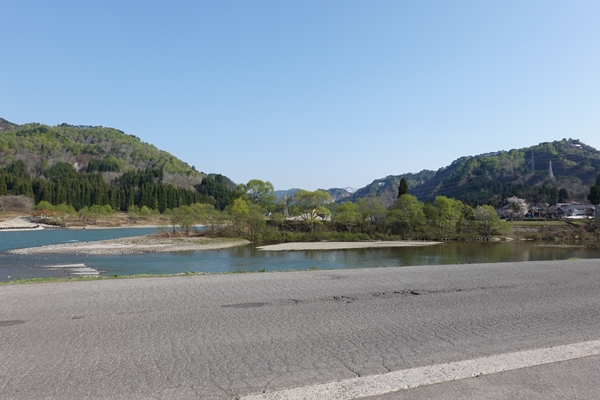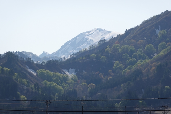 只見町に到着。白い山はどこ?・・浅草岳とか? |