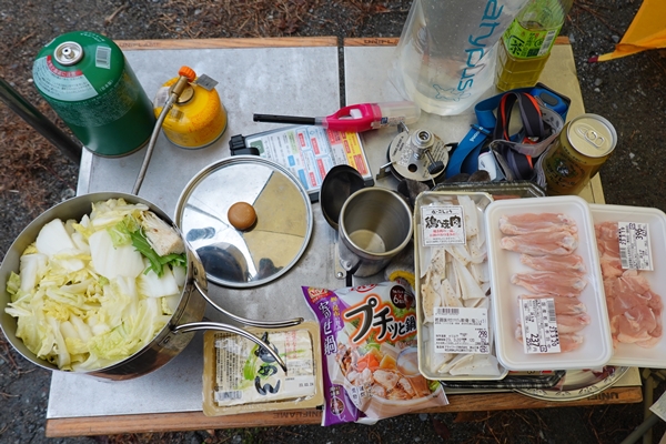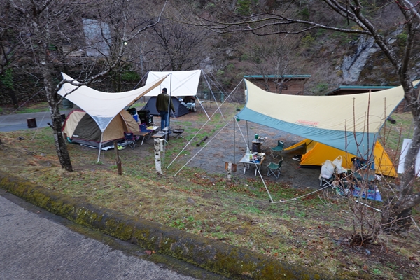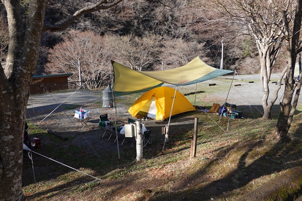 ソロサイトはタープ張るとほとんど埋まるので、組長一家とともにタープの下にテントのスタイルでした。 2日目は春の陽射して、諸々乾いてくれて助かりました。 |