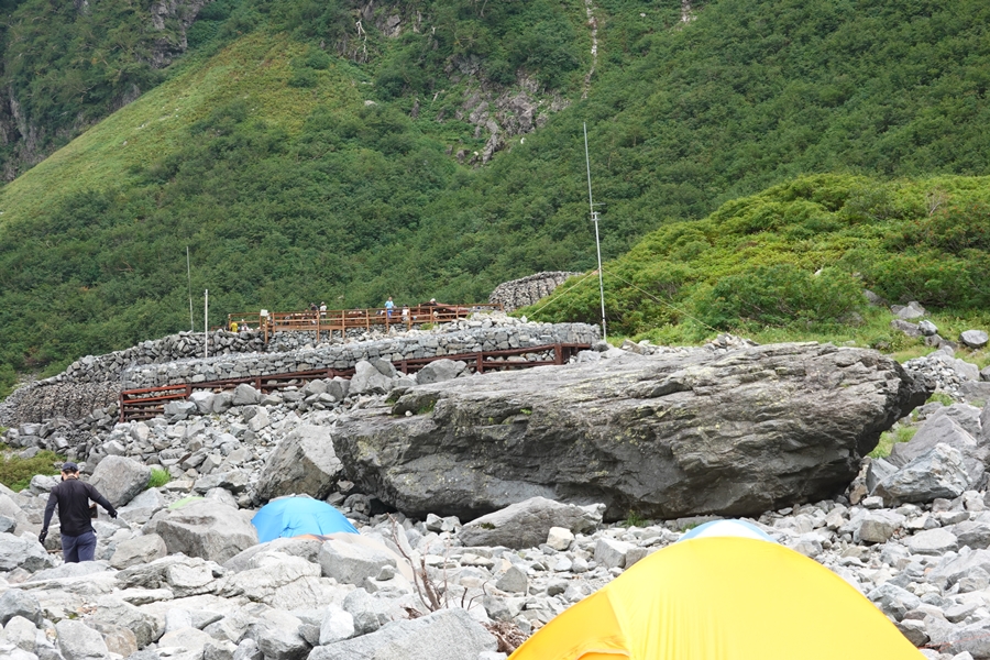 石だらけですが、1〜2人用のテントが張れるスペースが平らになっているところが沢山。 4人用だとコンパネ借りた方が張りやすいのかもしれません。ペグ打てないので石で固定。 |