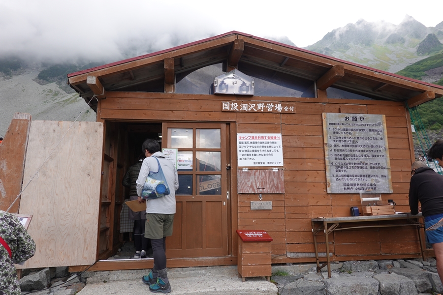 受付はサイトにある建物で。受付時間は15:00-17:00と短い。 |