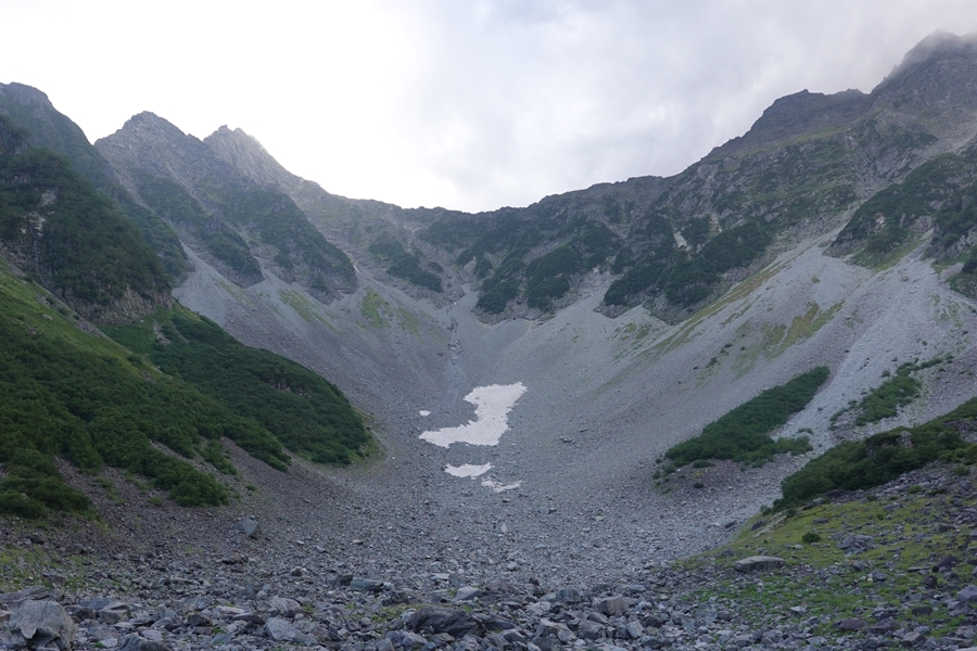 涸沢ヒュッテから見たテント場。石が転がっている一帯がテント場。 |