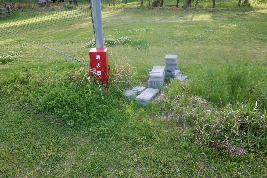 消火器と、高さの低い焚火台用のブロックが場内の所々に置かれてました。 |