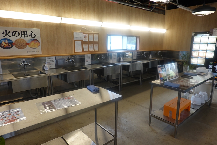 炊事棟の中・・お湯も出て快適。電子レンジもありました。 |