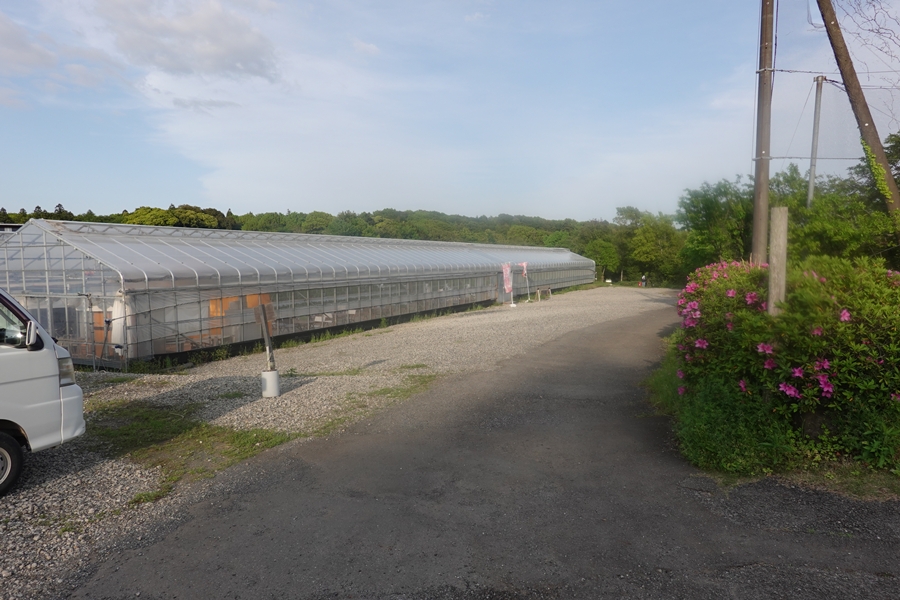 管理棟裏伸ビニールハウスはいちご狩り。売店で1パック1200円、いちご狩りはキャンプする人1500円でした。 |