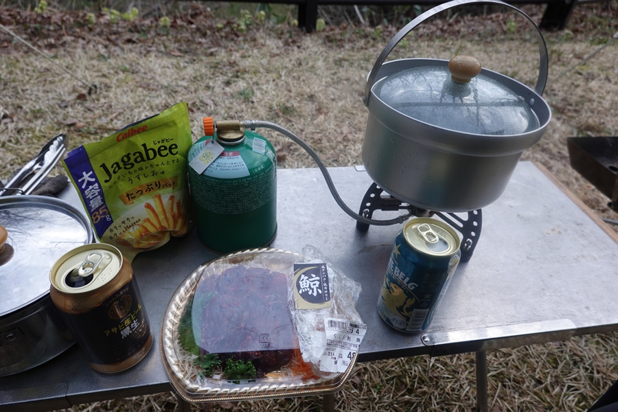鍋の素の味が違うだけで次男との千葉キャンプと同じメニュー。 毎度ワンパターンですね(苦笑)。 |
