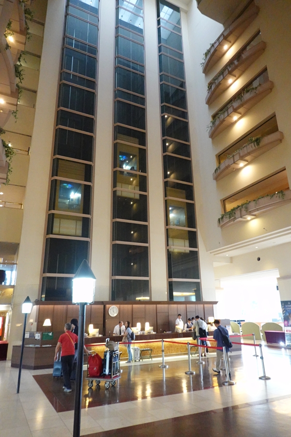 シャングリアという名前も、ホテル内の吹き抜けやガラス張りのエレベータも昭和感を感じますね。 |
