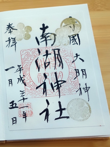 日本最古の公園と言われる南湖公園にある神社。御朱印は正月限定バージョンですが、初詣期間中は 紙印紙のみの対応でした。(オリジナル御朱印帳を購入する場合は特別対応有らしいです。) |
