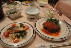 ペンションの夕食。子供も大人と同じメニューのため、大人が子供の分も多少食べ、お腹いっぱい。