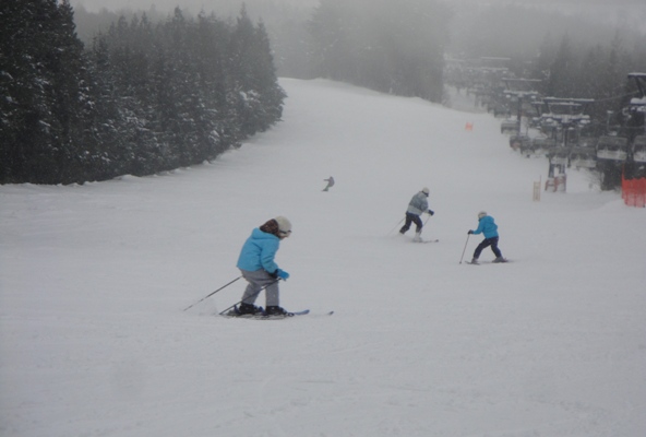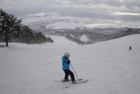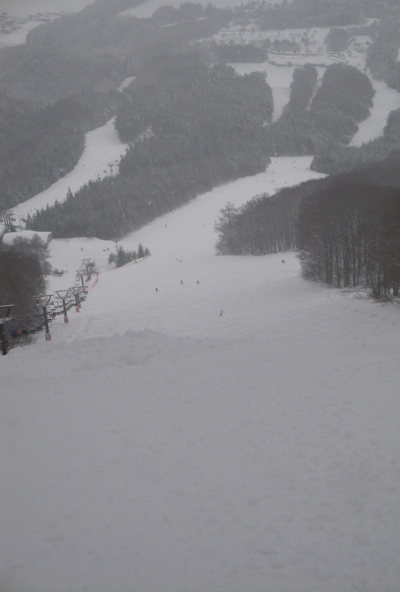 | ミネロ第4リフトを上がってゲレンデを見下ろす。赤埴大回転コースは我が家には無理。。。 |