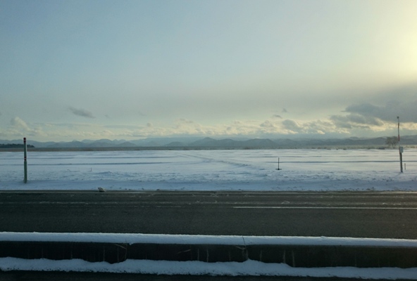 おまけ:猪苗代湖〜雪少ないですが雪原に日が射してきれい。ユンは爆睡中(笑)。 |
