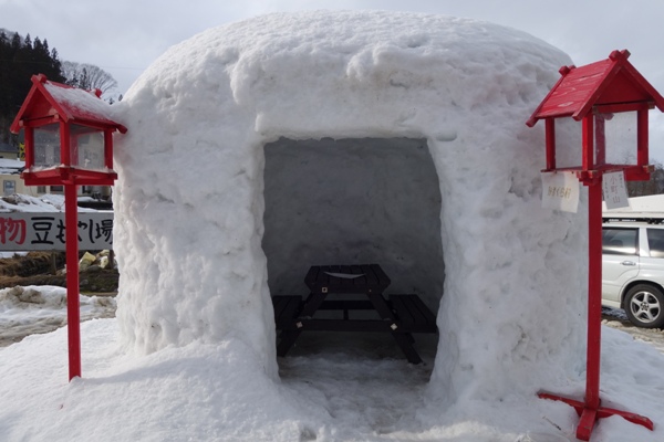 食堂の向かいにあったかまくら。暖かさのせいかちょっと傾いていて入るのに勇気が必要。。 |